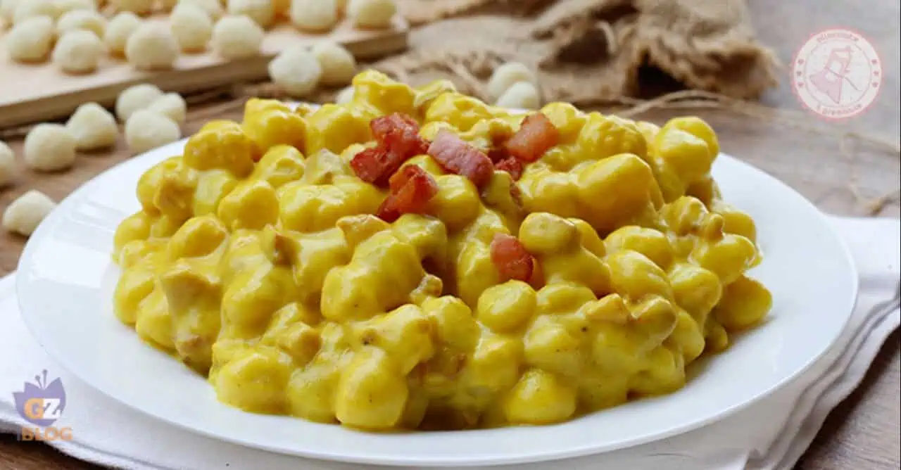 La padella va scaldata a fiamma vivace. La pancetta rosola in pochi istanti, diventando dorata e irresistibile; quando il grasso ha rilasciato tutto il suo profumo, i cubetti vengono tolti dal fuoco e tenuti da parte.intanto un’ampia pentola d’acqua salata raggiunge l’ebollizione. Gli gnocchi scivolano nel liquido e,non appena affiorano,sono pronti per essere scolati. Nella stessa padella in cui la pancetta ha sprigionato il suo aroma, il formaggio spalmabile si scioglie, aiutato da un mestolo di acqua di cottura degli gnocchi. Arriva il momento dello zafferano: la polvere si scioglie, tingendo la salsa di un giallo intenso. Il parmigiano grattugiato si unisce alla crema, rendendola ancora più ricca. Gli gnocchi lessati passano direttamente in padella e si mescolano fino a quando ogni pezzo è completamente avvolto dalla salsa. Solo allora la pancetta croccante rientra in scena, regalando l’ultima spinta di sapore.